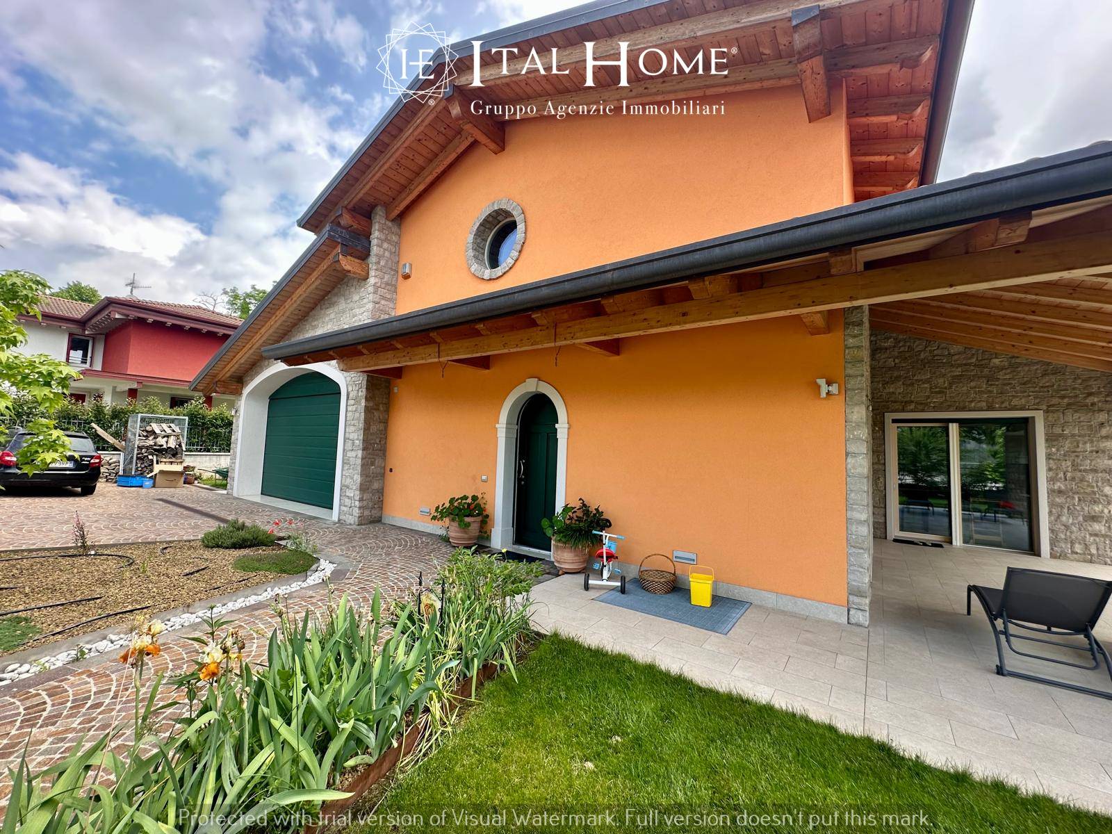 Un accesso carraio dal giardino conduce ai posti auto esterni ed al garage di quasi 50 mq con porta sezionale automatizzata, il garage è dotato anche di una porta interna per accedere all'abitazione.